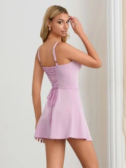 Women Summer Casual Sling Dress Solid Color Tie-Up Fishbone Waist Shaping Sleeveless Backless Short Dress Fashion Party Dress