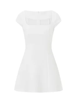 Women’s Cap Sleeves Mini Dress Solid Color Square Neck Slim A-Line Dress with Pockets