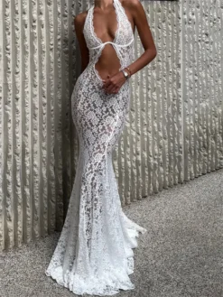 Women’s Lace Halter Dress Stylish Solid Mesh Lace Floral See Through Sleeveless Slim Fit Long Bodycon Fishtail Dress
